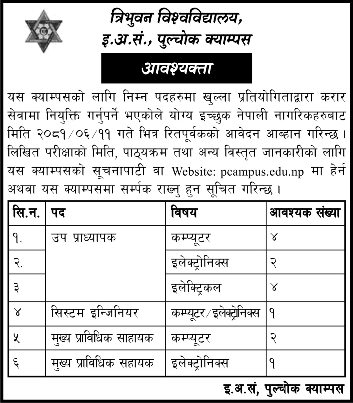 पुल्चोकस्थित इन्जिनियरिङ अध्ययन संस्थानले करार सेवामा विभिन्न पदका कर्मचारीहरूको आवश्यकता रहेको सूचित गरेको छ। क्याम्पसले कम्प्युटर विषयमा चार जना, इलेक्ट्रोनिक्समा दुई जना र इलेक्ट्रिकलमा चार जना उपप्राध्यापकको माग गरेको छ।